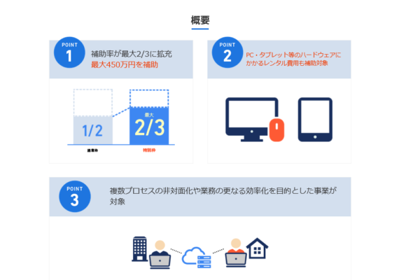 新型コロナウイルス感染症の流⾏が継続している中で、ポストコロナの状況に対応したビジネスモデルへの転換に向けて、労働生産性の向上とともに感染リスクに繋がる業務上での対人接触の機会を低減するような業務形態の非対面化に取り組む中⼩企業・小規模事業者等に対して、通常枠(A・B類型)よりも補助率を引き上げて優先的に支援する補助金です。